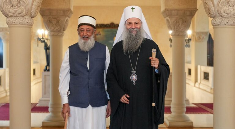 Photo: Sheikh Imran Hosein and Patriarch Porfirije, source: https://www.spc.rs/sr/news/patrijarh//15003.patrijarh-porfirije-razgovarao-sa-seihom-imranom-hoseinom.html